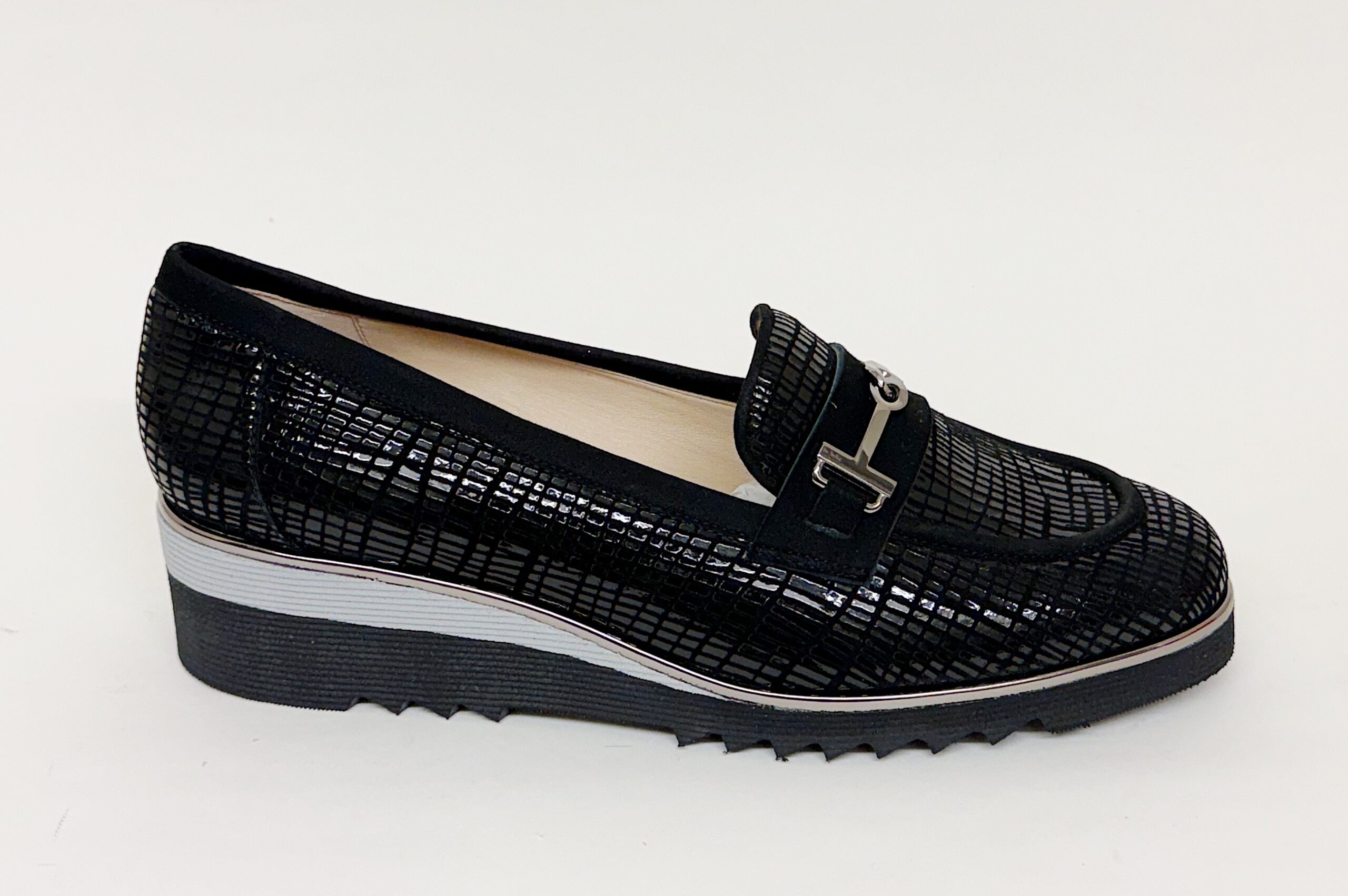 Mocassino da donna misure grandi in pelle stampata nera.