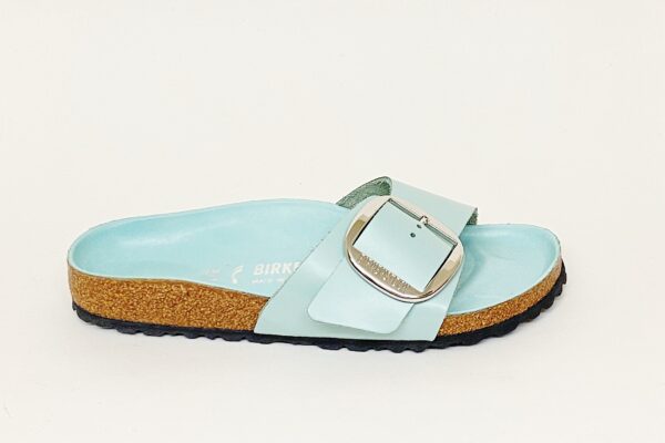 Pianella Birkenstock Madrid Big Buckle da donna misure grandi in pelle azzurra.